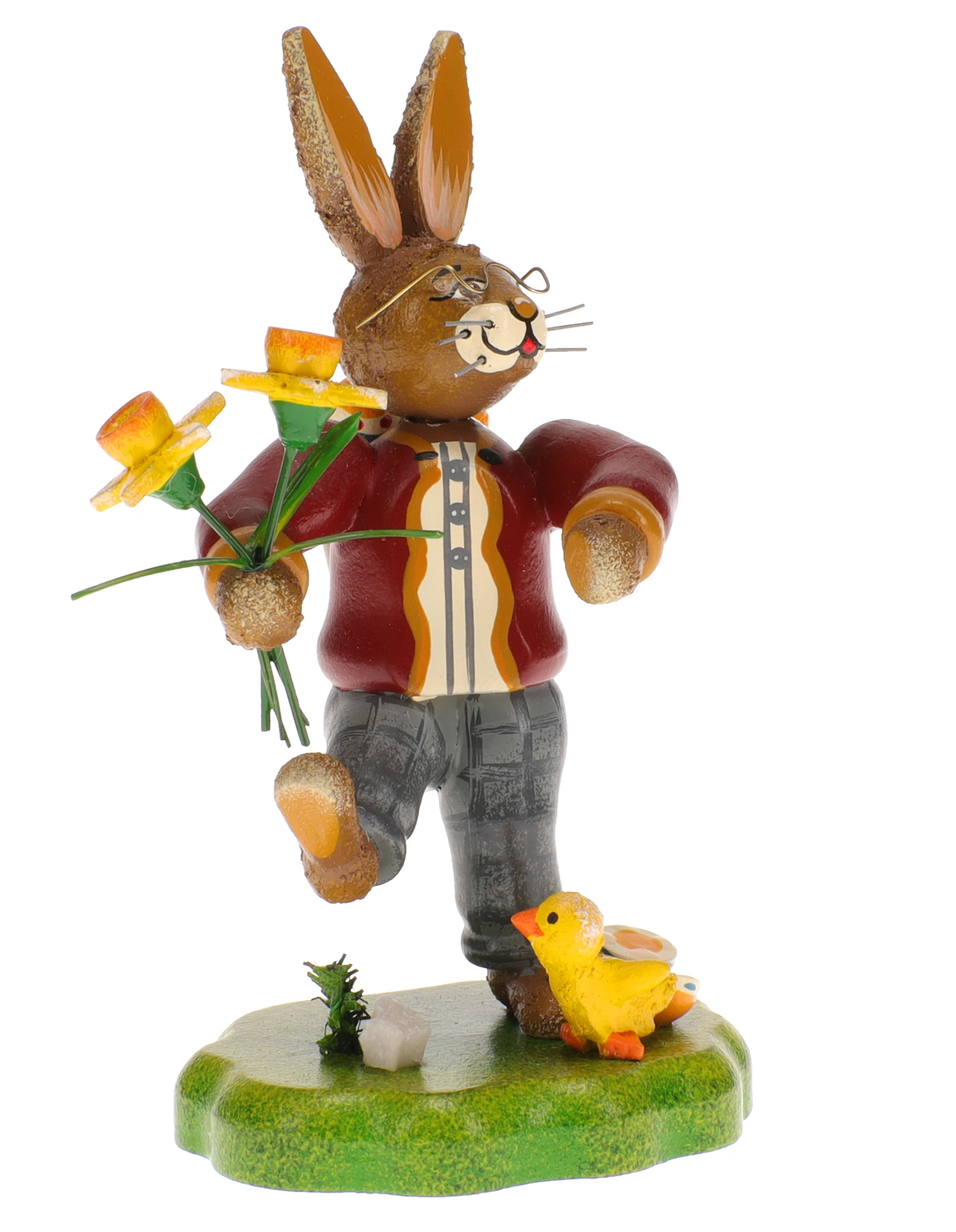 Die Hubrig Miniatur Hasenvater mit Narzisse gehört zum großen Sortiment aus dem Hause Hubrig Volkskunst. Der Hase besitzt eine Höhe von 10 Zentimetern. Diese handbemalte Miniatur aus Holz begeistert mit ihren liebevollen Details und unverwechselbarem Charme der Marke Hubrig.