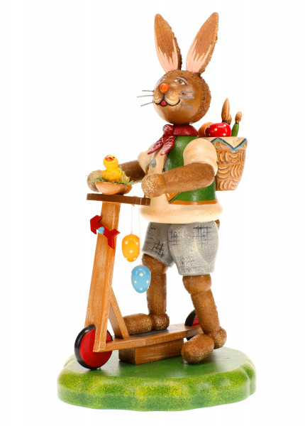 Karl der Maler ist ein wahrer Künstler auf zwei Rädern! Mit seinem Roller düst er voller Tatendrang durch das Hasenland, bereit, seine nächste kreative Idee umzusetzen. Gekleidet in einer eleganten Malerweste mit leuchtendem Grün und einem roten Schal, strahlt er Lebensfreude und Kreativität aus. Seine Hosentasche ist voller kleiner Details, die seine Handwerkskunst widerspiegeln. Besonders liebevoll gestaltet ist das gelbe Küken in seinem Körbchen, das fröhlich auf einem frischen Nest thront.