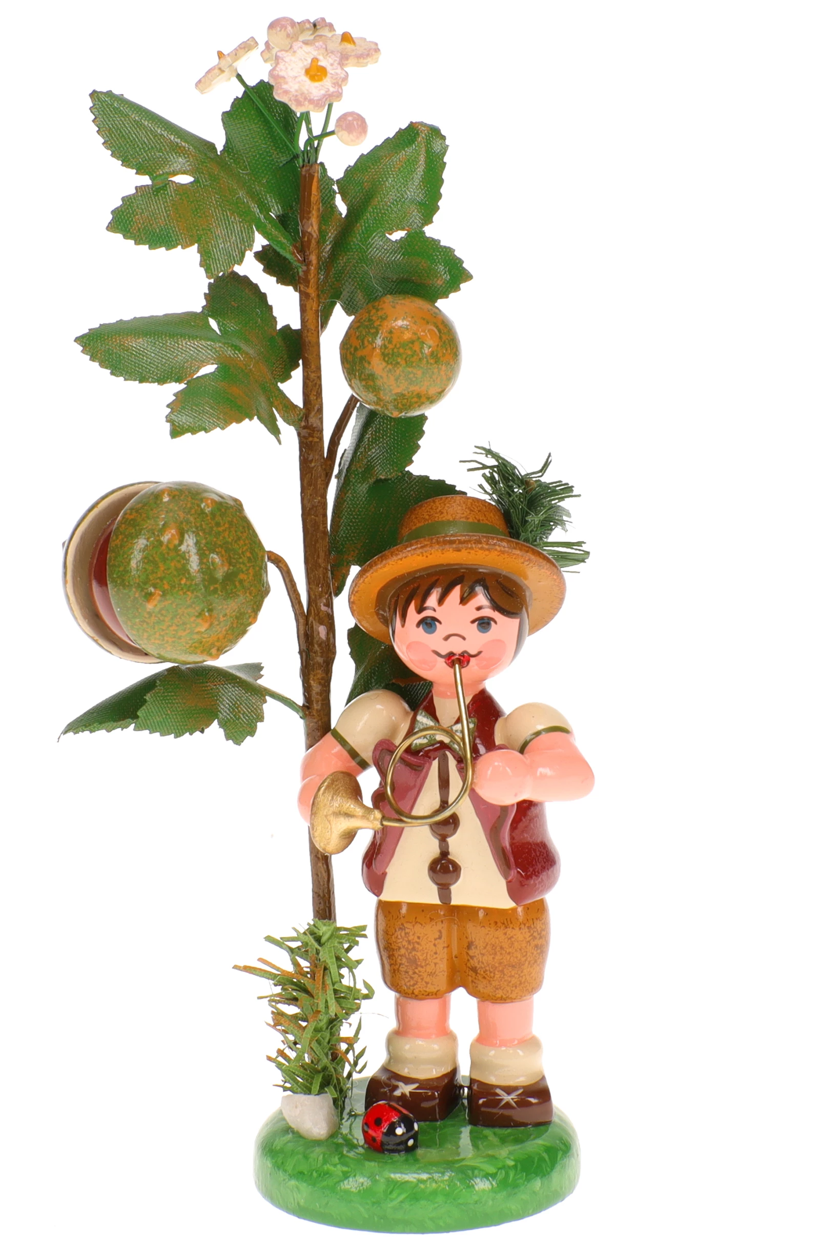Der Junge spielt das goldene Horn mit beiden Händen. Er trägt eine lila Weste und ein weißes Hemd darunter. An der Weste hat er sich eine grün-weiße Fliege gebunden. Auf dem Kopf sitzt ein brauner Hut, der mit einem grünen Tannenzweig bestückt ist. Er trägt eine kurze braune Hose und braune Schuhe. Der Junge steht vor einem kleinen Kastanienbäumchen, an dem zwei Kastanien hängen. Aus der größeren Kastanie guckt schon der braune Kern raus. Auf dem Bäumchen blühen weiße Blüten. Auf dem Boden krabbelt ein kleiner Marienkäfer umher. Der Junge musiziert auf einem grünen Sockel.