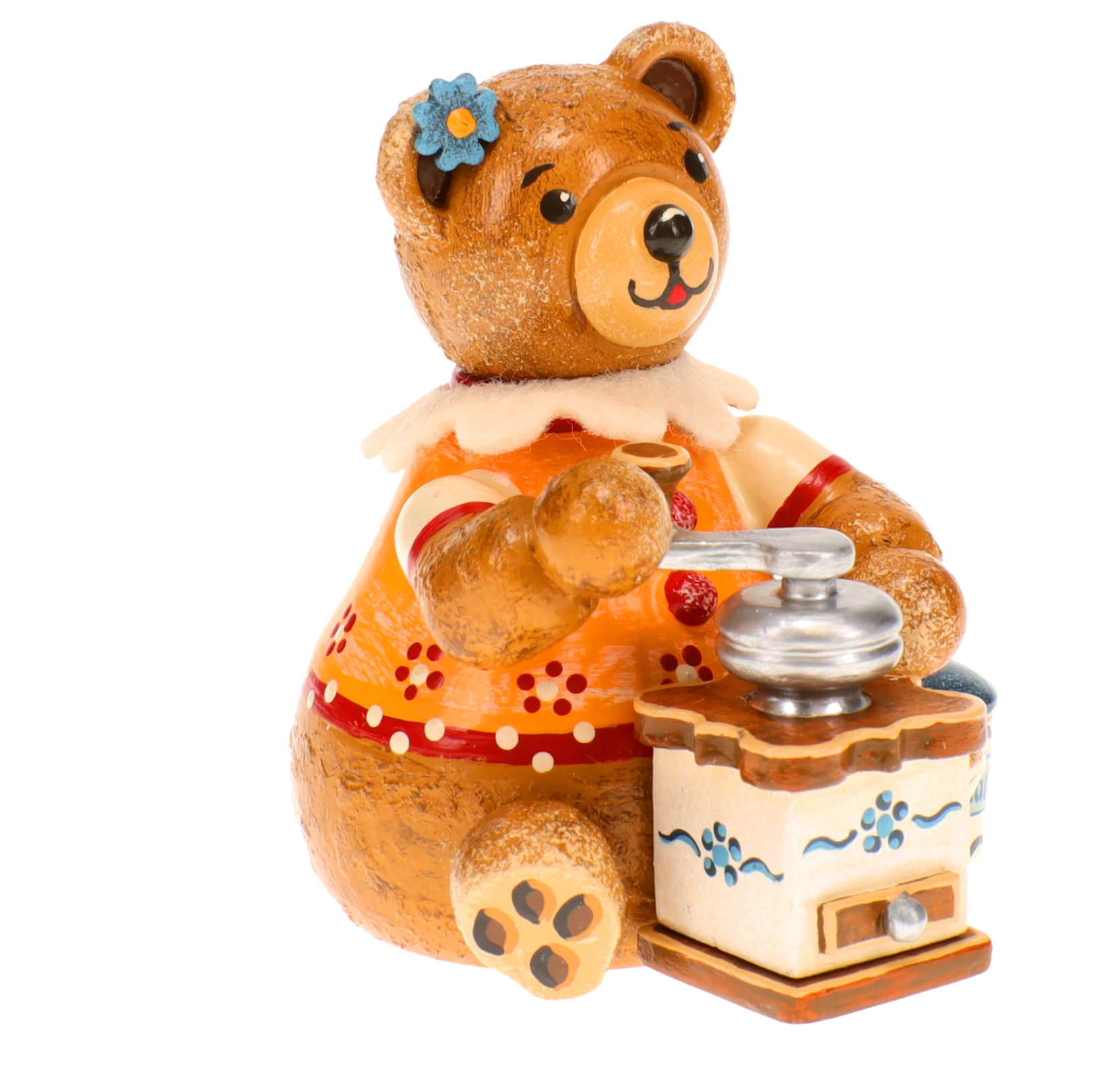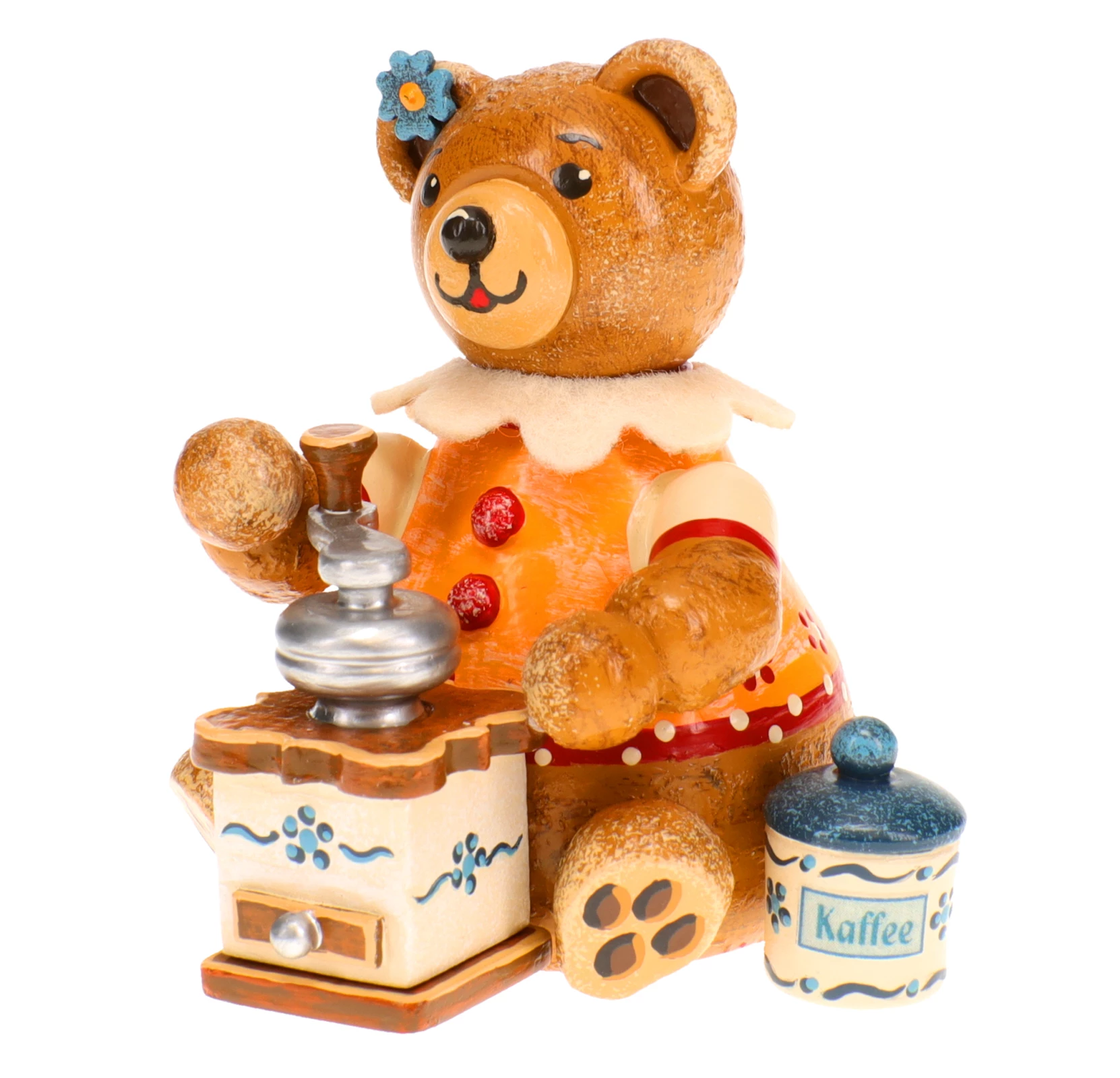 Vor ihr steht eine detailreiche, traditionelle Kaffeemühle aus Holz, deren Kurbel sie mit einer Pfote fest umfasst. Neben ihr befindet sich ein passendes Kaffeegefäß mit Deckel – ein kleines Accessoire, das die Szene harmonisch abrundet. Die feinen Bemalungen, die leicht strukturierten Felloberflächen und die farblich abgestimmten Muster zeigen deutlich die typische Handschrift der Hubrig Volkskunst.