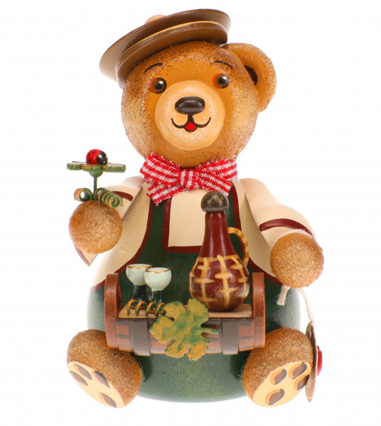 Vor dem Teddy befindet sich ein Tablett, dessen Unterseite wie ein Fass aussieht. Darauf stehen eine große Flasche mit reifem Wein und zwei weiße Weingläser. An der Vorderseite des Tabletts hängt ein grünes Blatt. Der Teddy hält ein grünes Kleeblatt in der rechten Pfote fest. Auf diesem krabbelt ein kleiner Marienkäfer umher. Der Teddy trägt eine grüne Latzhose mit einem weißen Hemd darunter. Um den Hals hat er sich ein weiß-rotes Halsband gebunden. Auf dem Kopf sitzt eine braune Mütze.