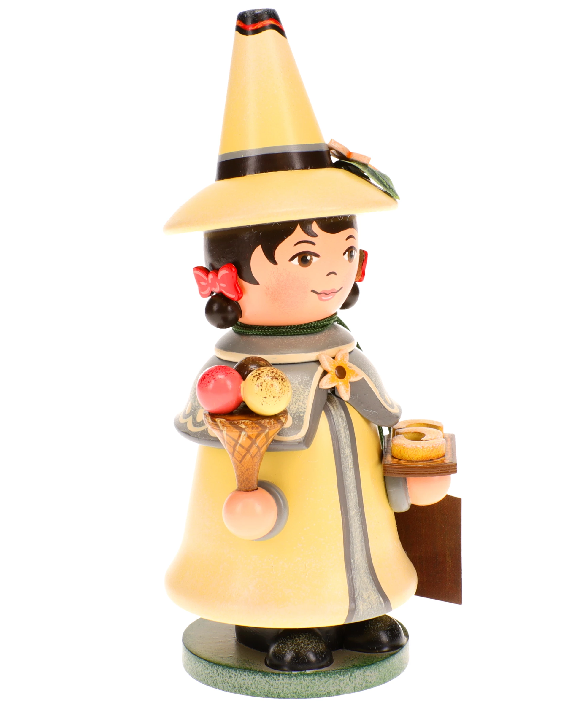 Der Wichtel trägt einen hohen cremefarbenen Hut mit Blüte und Blattdekor, passend zum fein verzierten Mantel. In seiner rechten Hand hält er ein kunstvoll gearbeitetes Waffelhörnchen mit drei farbigen Kugeln in Vanille-, Erdbeer- und Schokoladenoptik. In der linken Hand präsentiert er ein kleines Tablett mit detailreich gestaltetem Vanillegebäck.