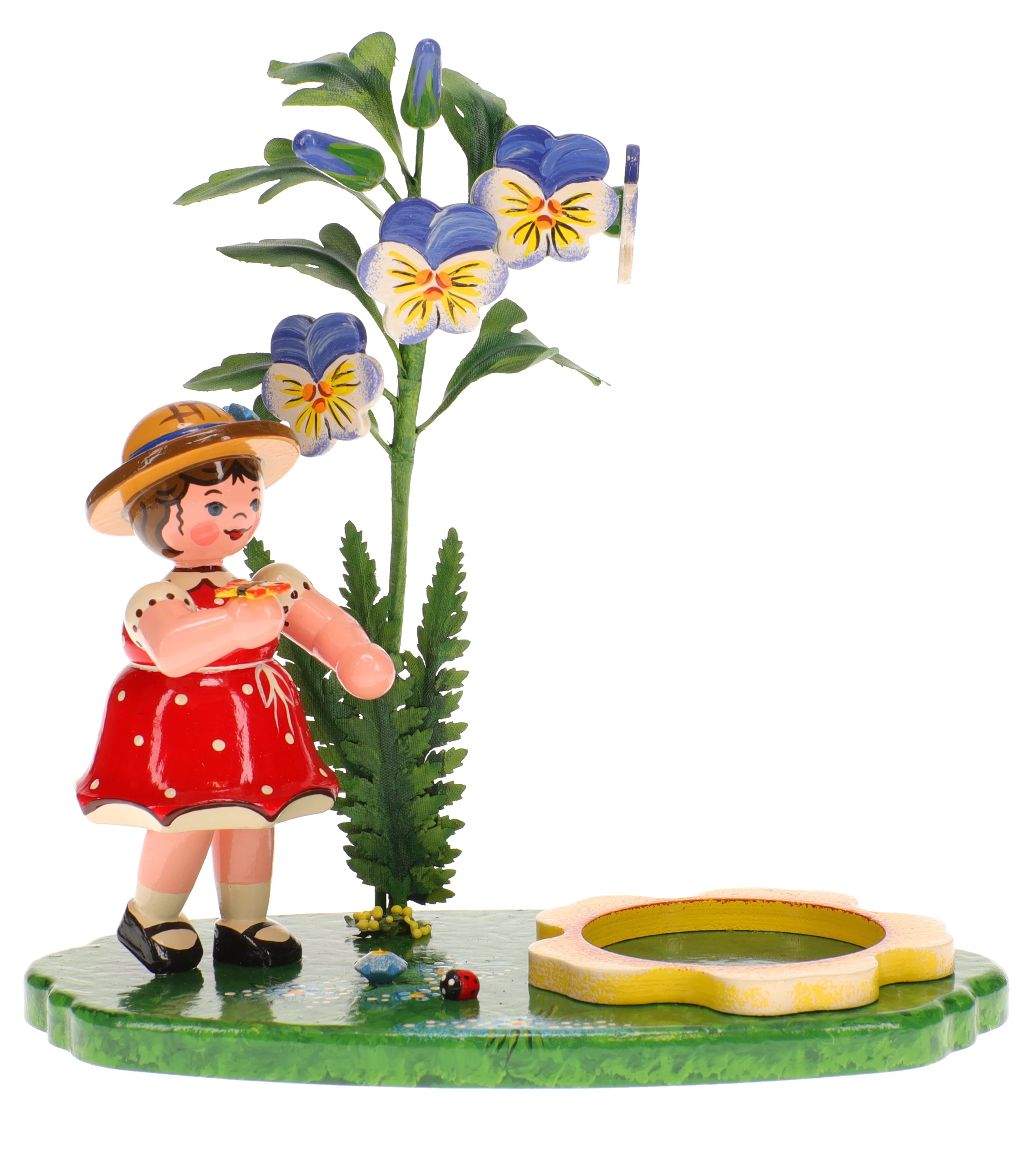 Das Hornveilchen hat einen grünen Stängel und vier blau-gelbe Blüten. Am Stängel hängen noch zwei Knospen, die bald erblühen werden. Das Mädchen trägt ein rotes Kleidchen mit kurzen weißen Ärmeln. Auf dem Kopf sitzt ein brauner Strohhut mit blauem Band. Sie trägt weiße Strümpfe und schwarze Schuhe. Auf der linken Hand des Mädchens ist ein kleiner rot-gelber Schmetterling gelandet. Rechts neben ihr bietet ein gelber, blumenförmiger Stellplatz eine Möglichkeit, ein hübsches Teelicht hinzustellen. Dazwischen krabbelt ein kleiner Marienkäfer umher. Das Mädchen und das Hornveilchen stehen auf einem grünen Sockel.