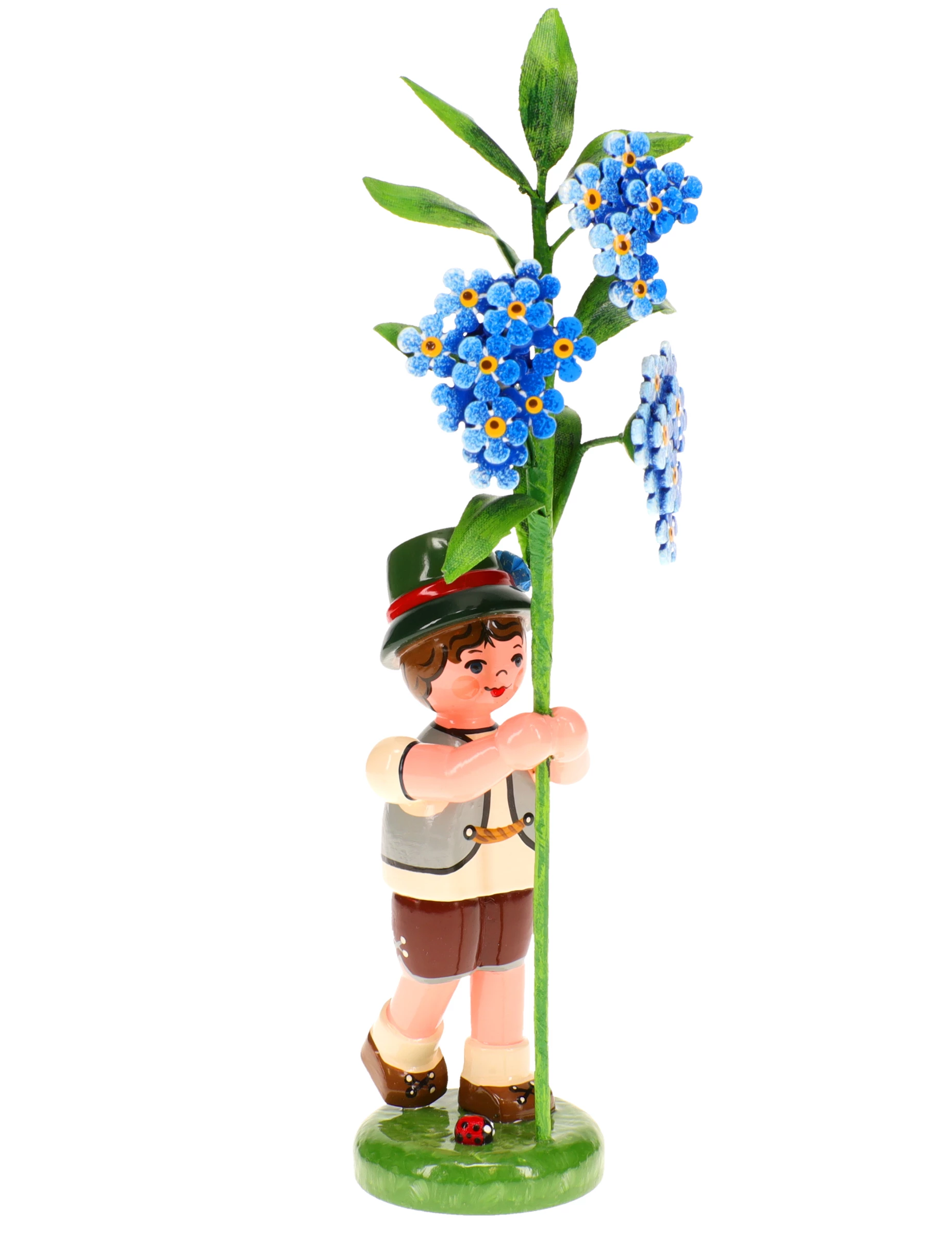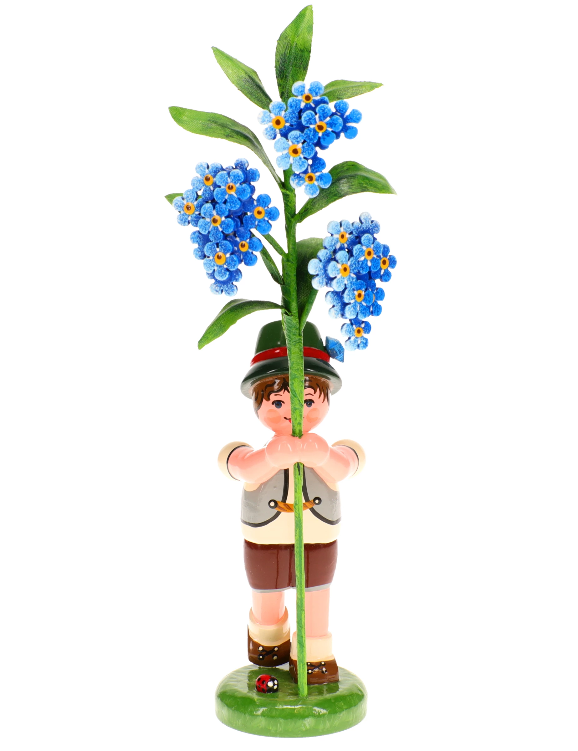 Das Hubrig Blumenkind „Junge mit Vergissmeinnicht“ ist eine eindrucksvolle, 17 cm hohe Miniatur aus der Hubrig Volkskunst und begeistert durch seine liebevolle Gestaltung und die charakteristische Handbemalung. Die Figur zeigt einen kleinen Jungen in traditioneller Tracht mit Lederhosen, Hemd und einem grünen Hut, der mit einer blauen Blüte verziert ist – passend zum Thema der Miniatur.