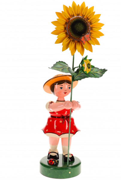 Die Hubrig Großfigur Großes Blumenmädchen mit rotem Kleid und Sonnenblume gehört zum Blumenkinder-Sortiment aus dem Hause Hubrig Volkskunst. Das Blumenmädchen besitzt eine beachtliche Höhe von 60 Zentimetern. Diese handbemalte Großfigur aus Holz begeistert mit ihren liebevollen Details und unverwechselbarem Charme der Marke Hubrig.