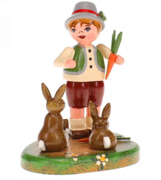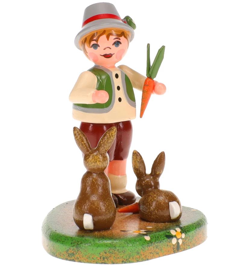 Der Junge trägt eine grüne Weste und ein weißes Hemd darunter. Auf dem Kopf sitzt ein grauer Hut. In der linken Hand hält der Junge eine orangene Möhre. Vor ihm sitzen zwei hungrige Häschen auf dem Boden. Das linke Häschen hält seine zwei Pfoten nach außen gestreckt. Vor dem rechten Häschen liegt eine zweite Möhre auf dem Boden. Der Junge und seine Häschen stehen auf einem grün-braunen Sockel.
