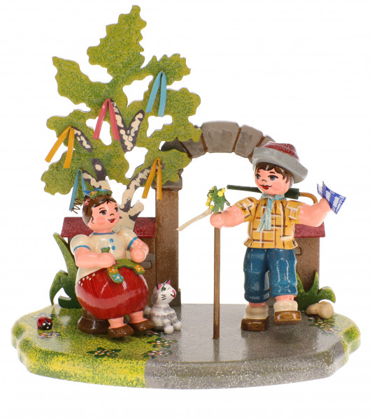 Der Junge tritt aus einem steinernen Tor hervor. Er hält in der rechten Hand einen Stab fest, der an der Spitze mit Pflanzen und einem weißen Band geschmückt ist. In der linken Hand hält er ein blau-weißes Taschentuch fest. Auf dem Rücken trägt der Junge einen grauen Rucksack mit einem grünen Regenschirm darauf. Er trägt ein gelb kariertes Hemd. Um den Hals hat er sich ein hellblaues Halstuch gebunden. Auf dem Kopf trägt der Junge einen grau-roten Hut. Er trägt eine blaue Hose und braune Schuhe. Das Mädchen sitzt auf einem hölzernen Hocker fertigt einen Kranz an. Er ist mit roten, blauen und gelben Blümchen bestückt. Sie trägt ein gelb-rotes Kleid. Auf dem Kopf sitzt ein kleines Krönchen aus Blumen und eine blaue Schleife. Sie hat braune Schuhe an. Auf dem Boden krabbelt ein kleiner Marienkäfer vergnügt umher. Neben dem Mädchen hat sich ein grau-weiß gestreiftes Kätzchen dazugesellt. Der Baum hinter dem Steintor ist mit roten, blauen und gelben Bändern geschmückt. Der Sockel besteht aus einer grünen Wiese und einem grauen Gehweg.