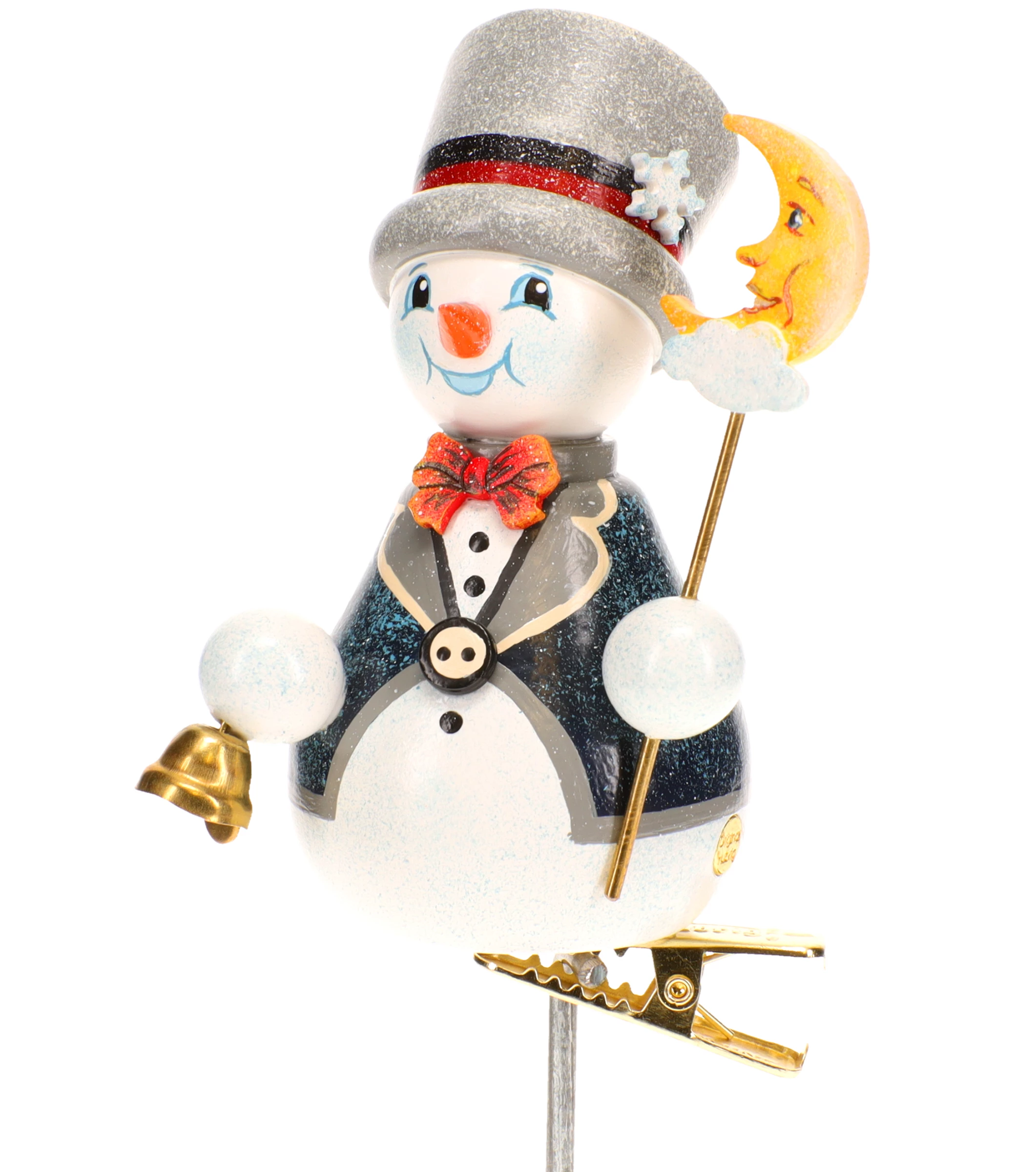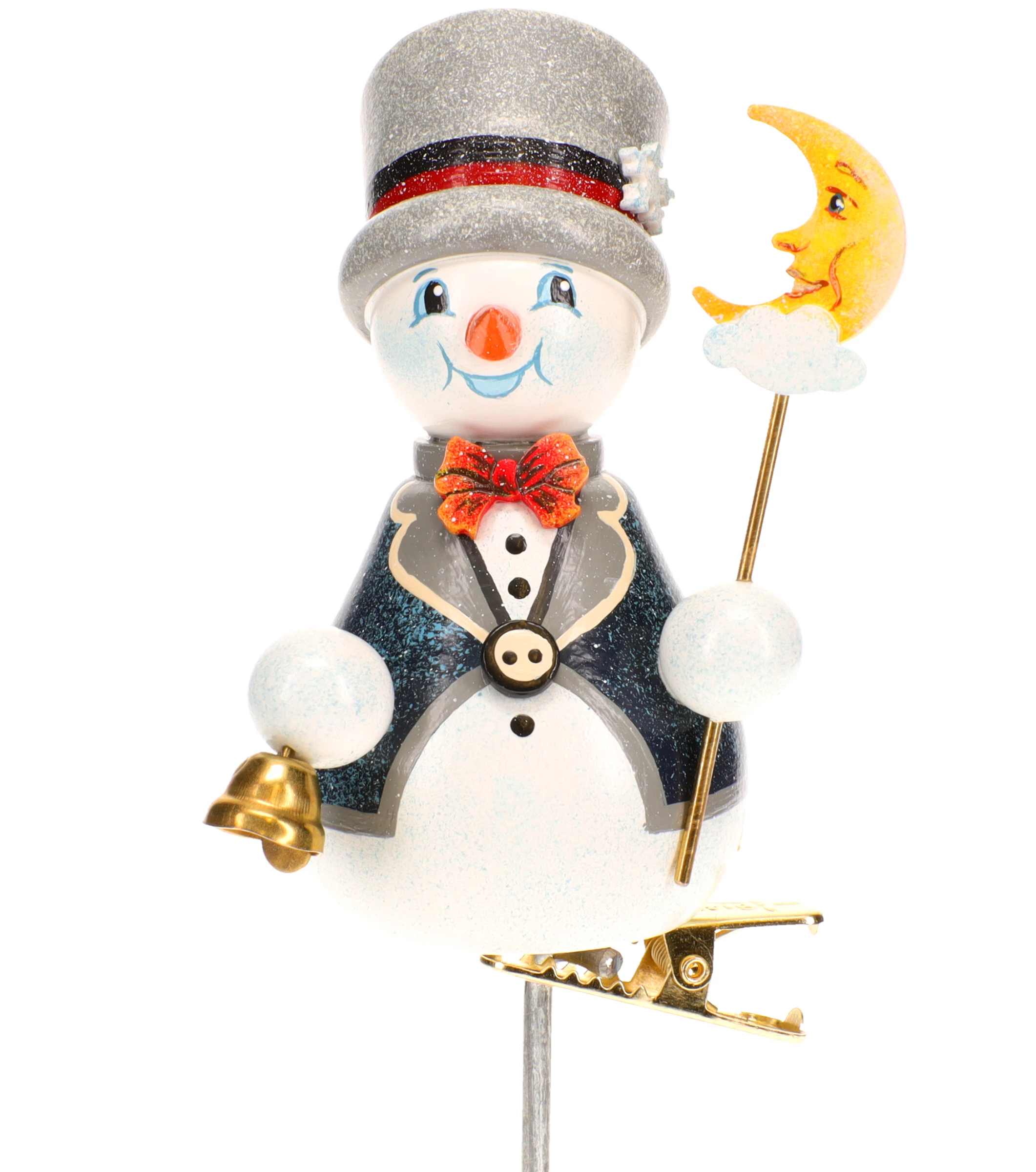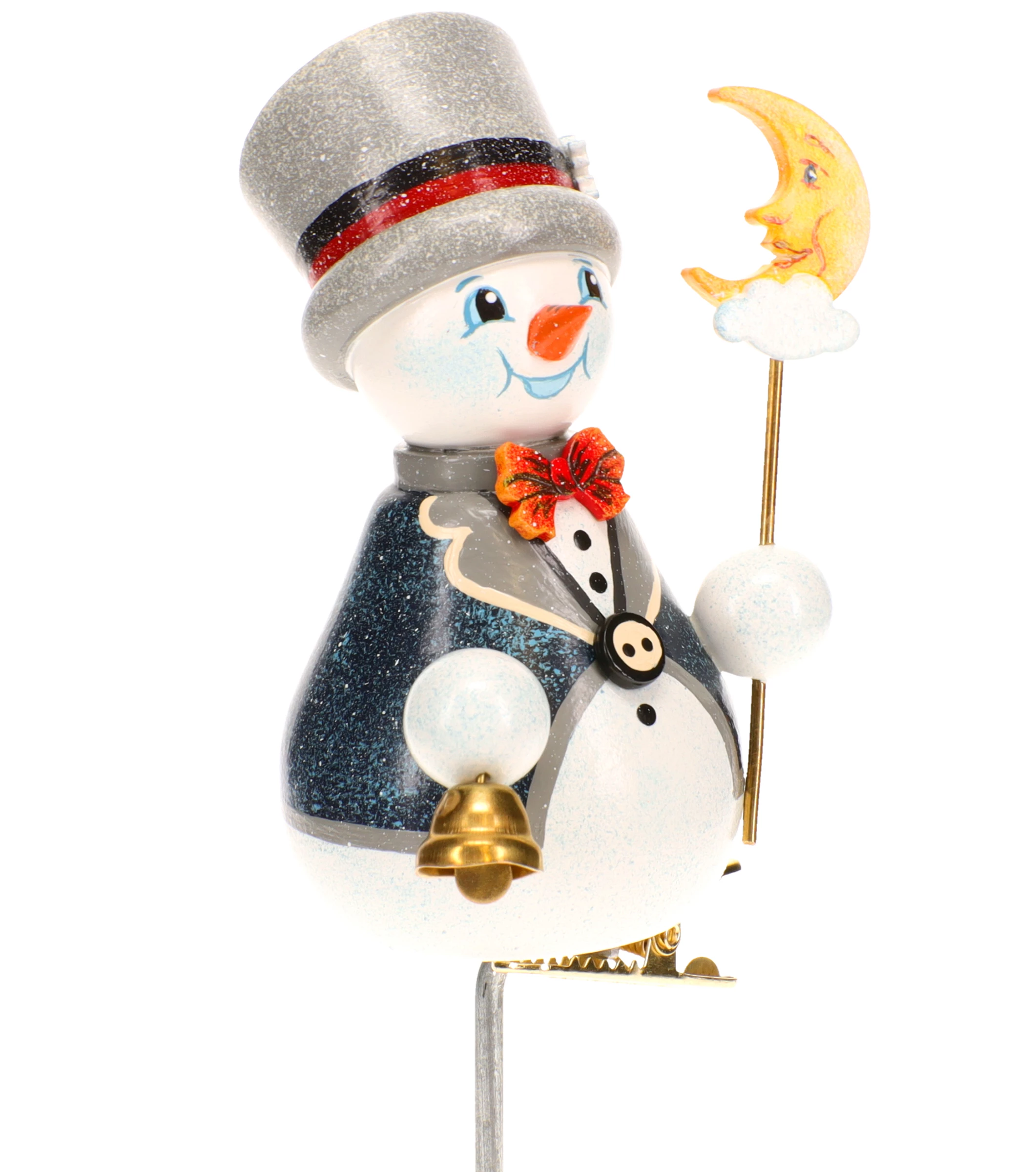 Das Schneemännchen trägt einen silbrig schimmernden Zylinder mit rotem Band und Schneeflockendetail. Sein freundliches Gesicht mit Karottennase und blauen Augen strahlt pure Winterfreude aus. Bekleidet ist es mit einem elegant gestalteten Mantel in dunklem Blau, verziert mit feinen Konturen, Knöpfen und einer roten Schleife. In der einen Hand hält das Schneemännchen eine kleine goldfarbene Glocke, in der anderen einen Stab mit lächelndem Mond, Wolke und Stern – ein märchenhaftes Detail, das diese Hubrig Volkskunst so besonders macht.