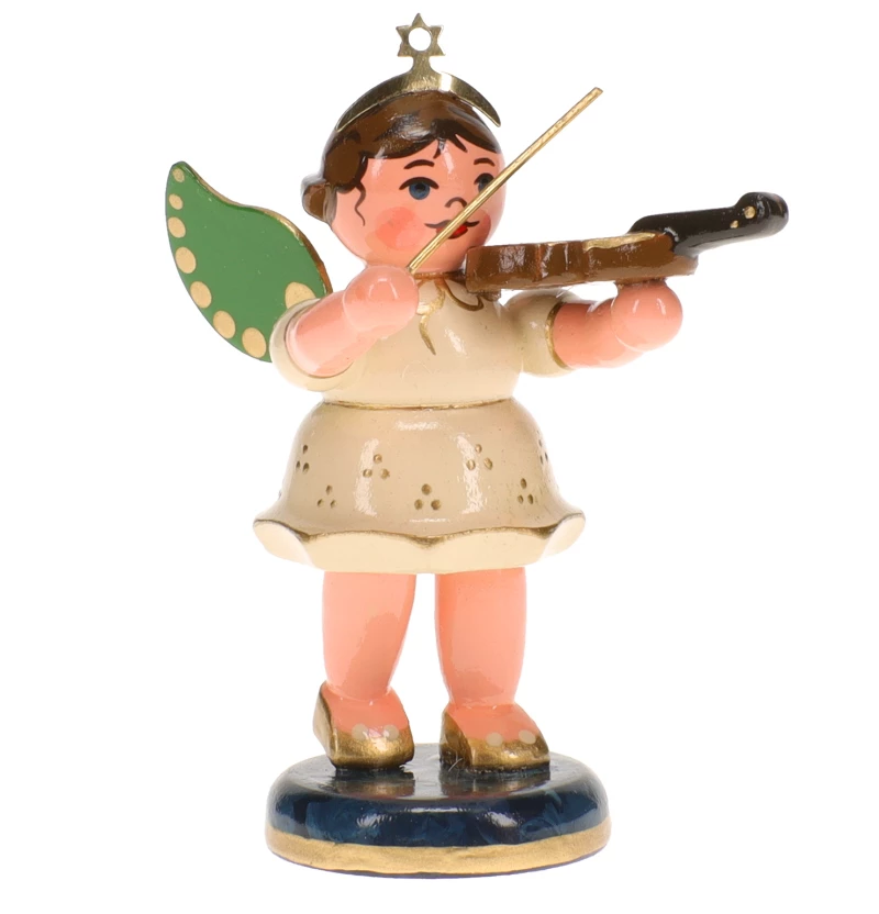 Der Engel hält die braune Geige in der linken Hand fest. Sie hat die Geige unter dem Kinn geklemmt. In der rechten Hand hält sie den Bogen in die Höhe. Der Engel trägt ein weißes Kleidchen mit einer goldenen Schleife um den Hals. Auf dem Kopf sitzt ein goldenes Krönchen. Sie hat goldene Schuhe an. Auf dem Rücken befindet sich ein grünes Flügelpaar mit goldenen Pünktchen. Der Engel musiziert auf einem dunkelblauen Sockel.