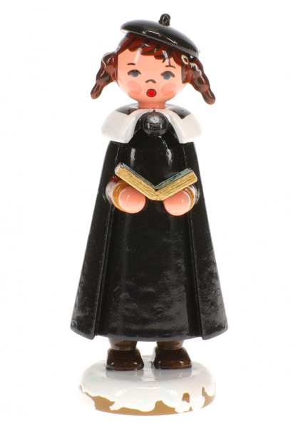 Das Kurrendemädchen trägt einen langen schwarzen Umhang. Auf dem Kopf sitzt ein schwarzer Hut. In beiden Händen hält sie ein rotes Gesangsbuch fest. Die Seiten sind golden umrandet. Das Kurrendemädchen singt auf einem eingeschneiten Sockel.