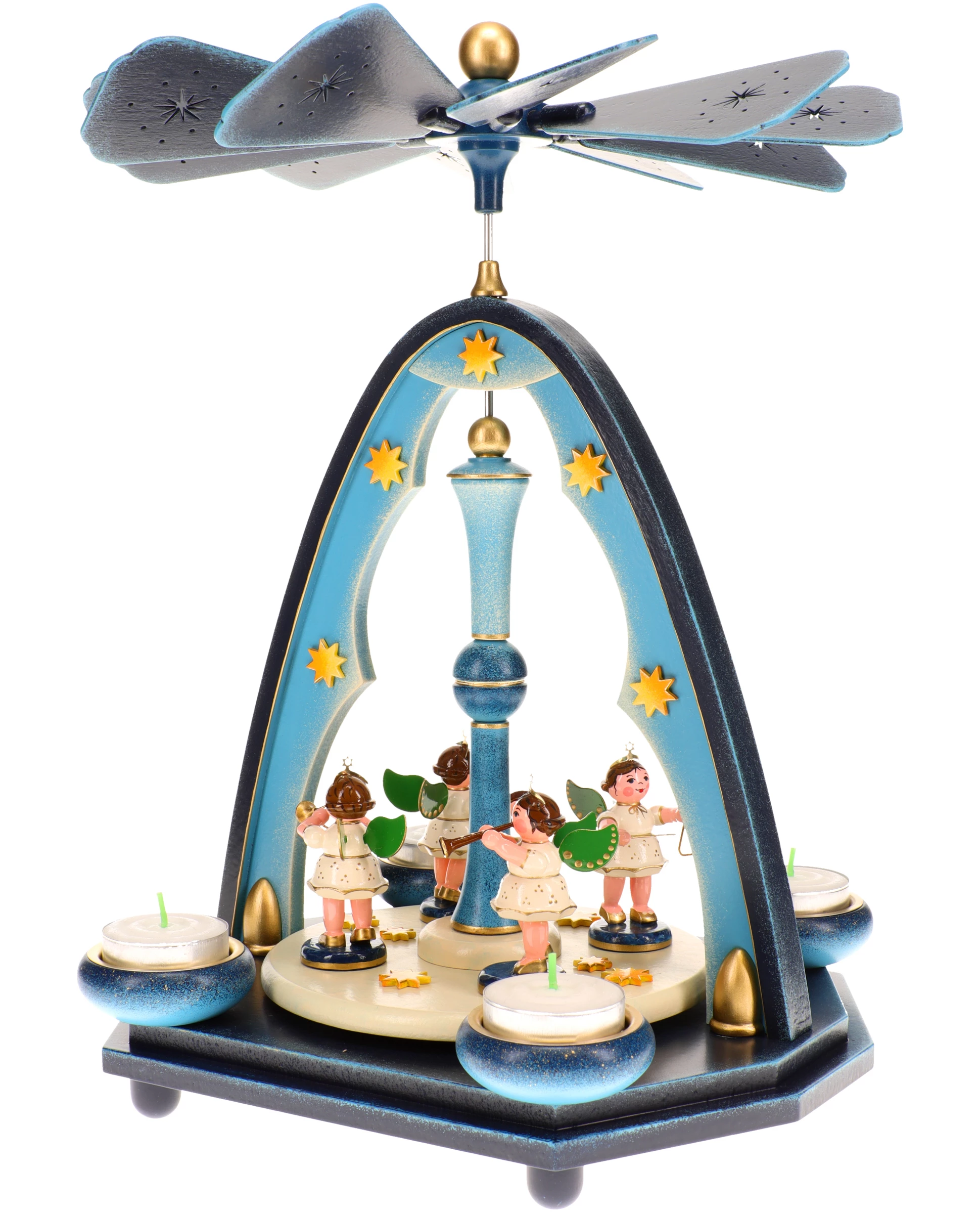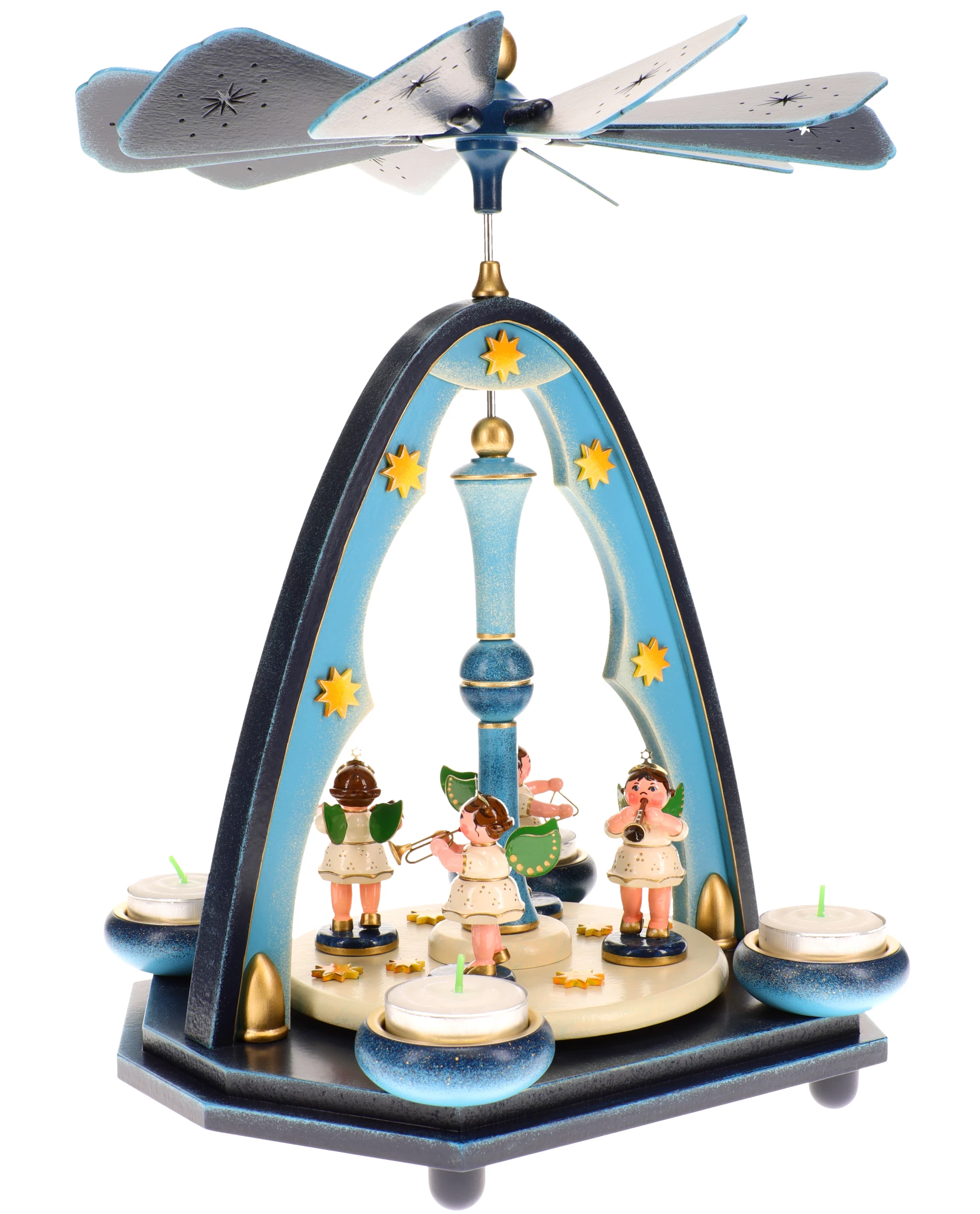 Die Hubrig Pyramide – Engelkonzert mit Teelichtern ist ein außergewöhnlicher Hubrig Artikel, der Bewegung, Licht und Musik in einer harmonischen Szene vereint. Diese aufwendig gestaltete Hubrig Miniatur-Pyramide steht auf einer stabilen, dunkelblauen Grundplatte mit sanftem Farbverlauf und ruht auf kleinen Füßen, die ihr einen sicheren Stand verleihen.