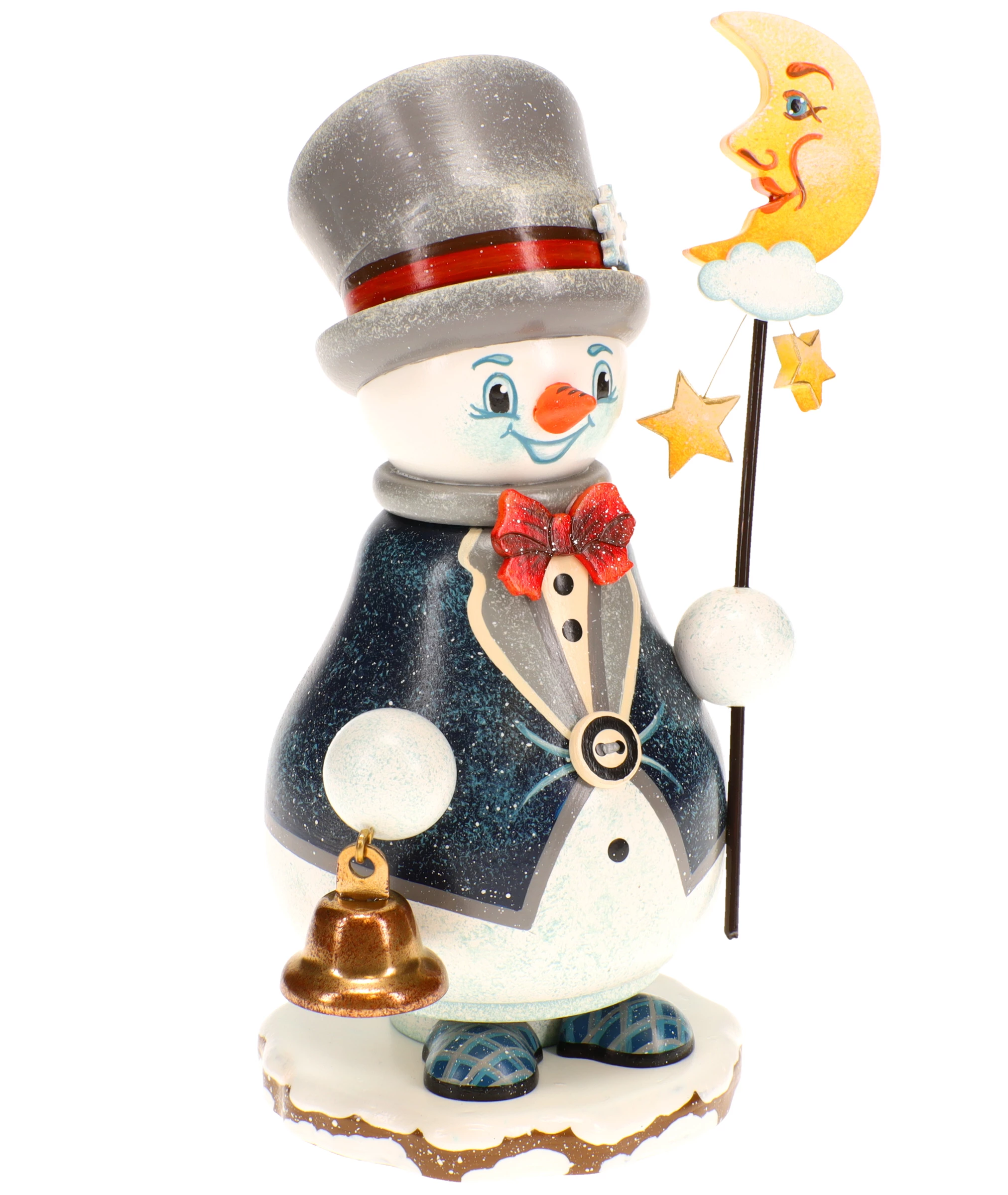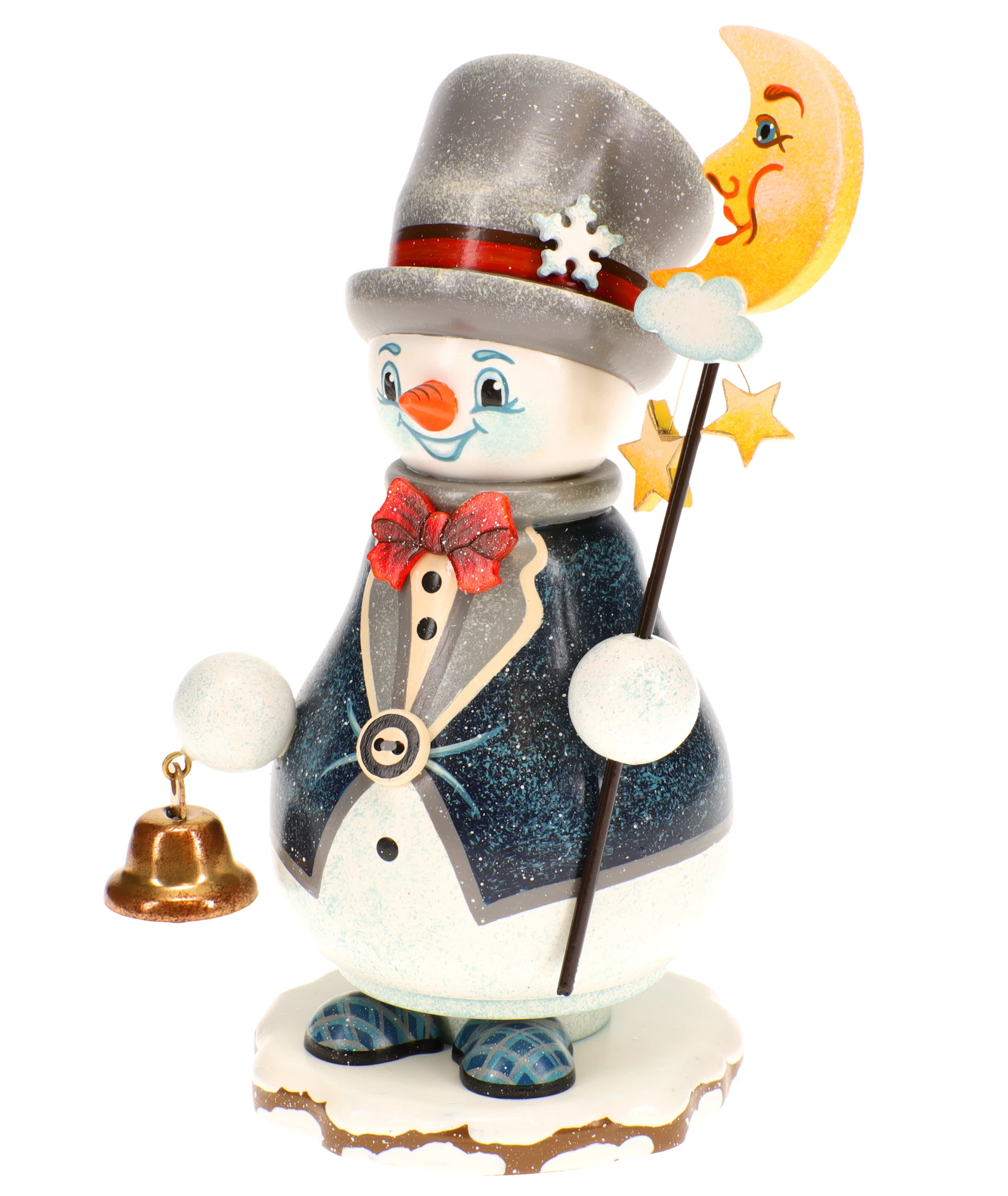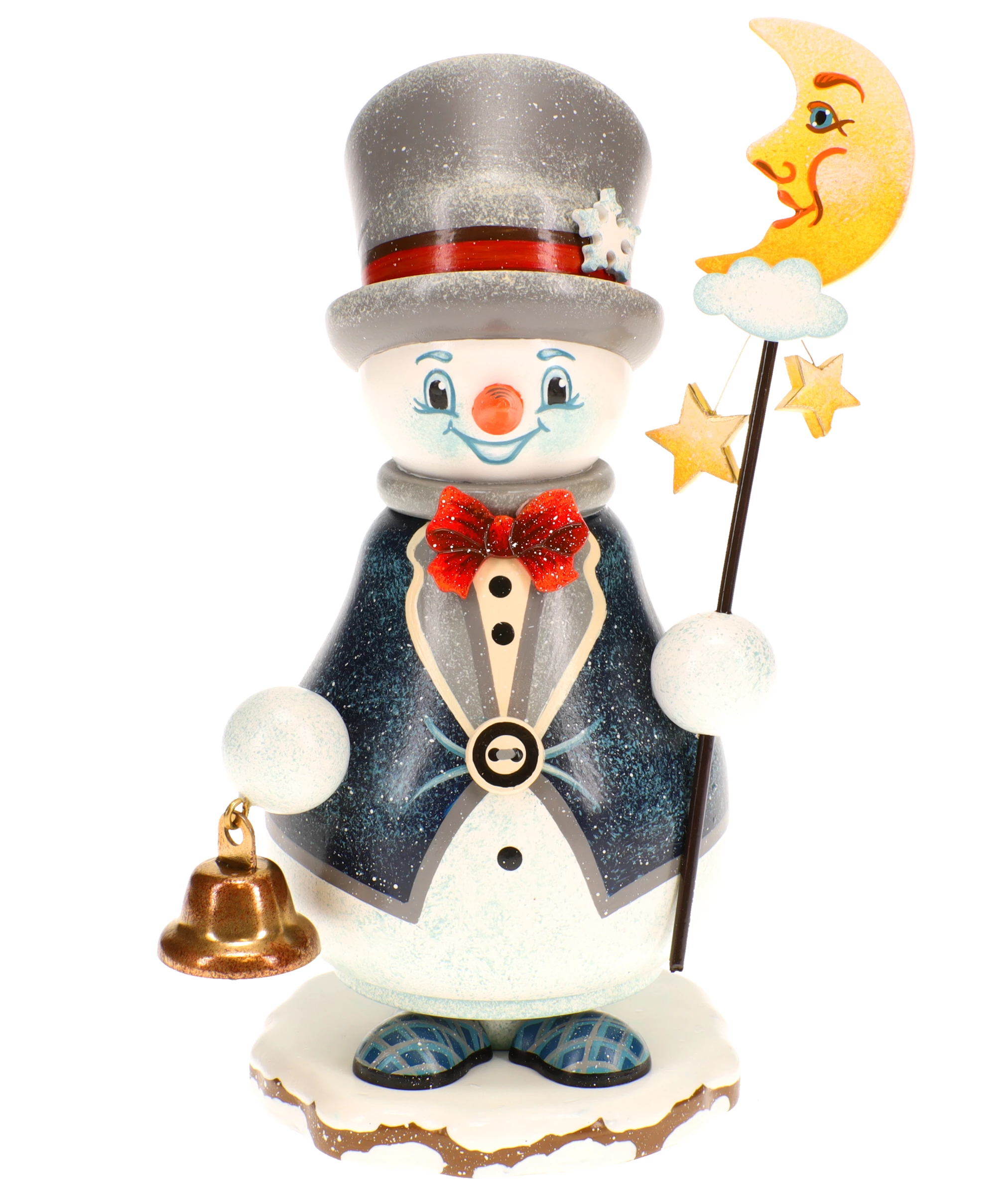 Der Räucherwichtel ist als eleganter Schneemann gestaltet und trägt einen dunkelblauen Mantel mit feinem Glitzereffekt, hell abgesetzten Kanten und dekorativen Knöpfen. Eine rote Fliege setzt einen lebendigen Akzent, während der graue Zylinder mit rotem Band und Schneeflockenverzierung dem „Mondwächter“ seine charakteristische Erscheinung verleiht. Das freundlich lächelnde Gesicht mit orangefarbener Nase, hellen Augen und sanften Farbübergängen sorgt für einen warmen, sympathischen Ausdruck.