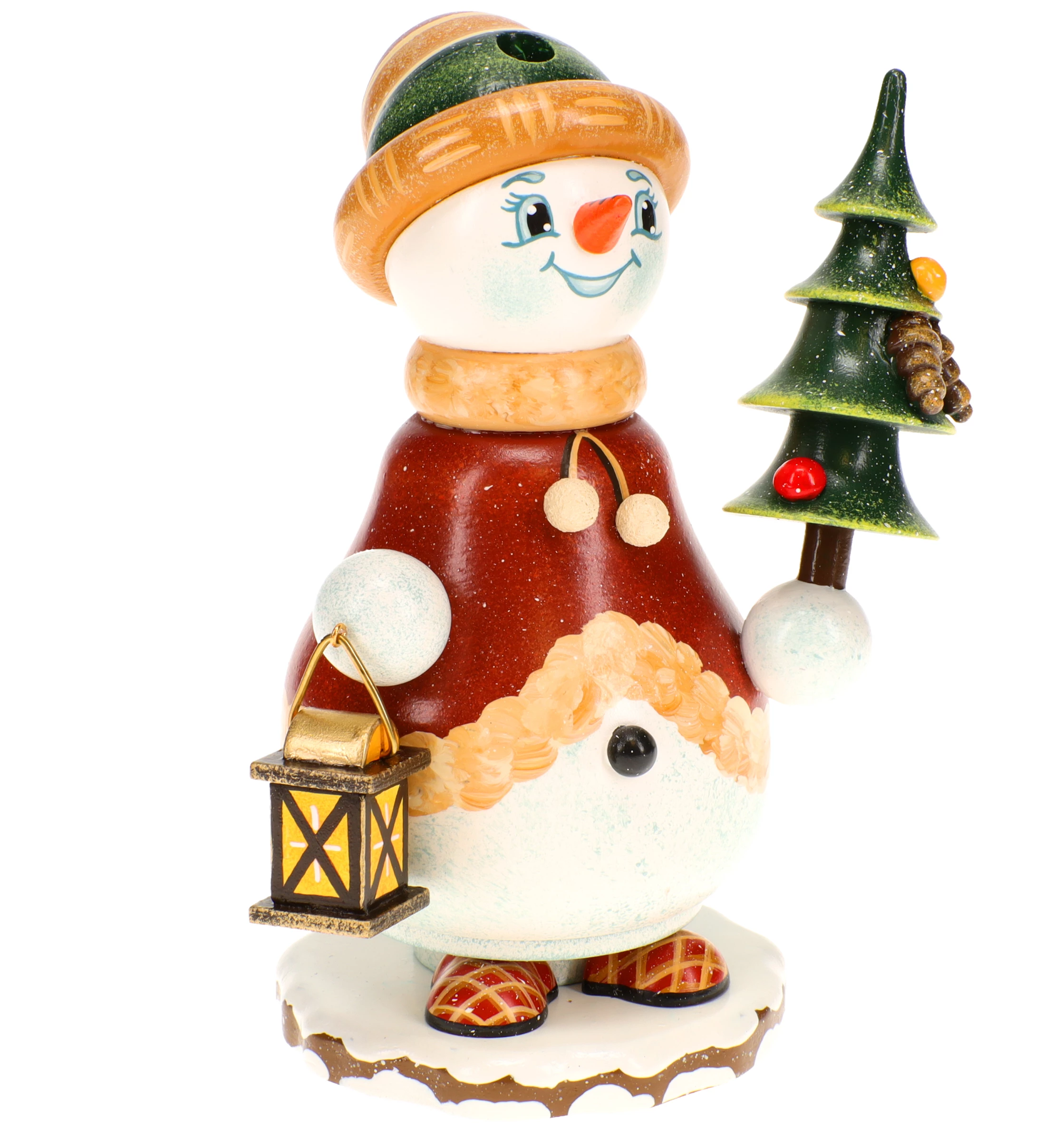 In der einen Hand hält der Räucherwichtel eine kleine Laterne mit gelb bemalten Fensterflächen, die wie ein leuchtender Begleiter wirkt. In der anderen Hand trägt er einen detailreich gestalteten Tannenbaum, geschmückt mit kleinen Kugeln und Zapfen. Diese liebevollen Details machen den besonderen Reiz dieser Hubrig Miniatur aus. Auf der Oberseite der Figur befindet sich die Öffnung für den Räucherkerzenrauch, der beim Verglimmen dezent aus dem Wichtel aufsteigt.