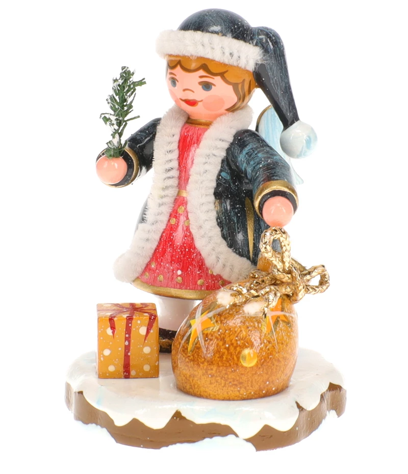 Das Himmelskind trägt einen blauen Mantel mit einem rosa Kleidchen darunter. Auf dem Rücken befindet ein hellblaues Flügelpaar. Auf dem Kopf sitzt eine blaue Zipfelmütze. Sie trägt weiße Strümpfe und schwarze Schuhe. Das Himmelskind hält einen dicken Geschenkebeutel mit der linken Hand fest. Dieser ist mit einer goldenen Schnur zugebunden. Daneben liegt ein orange eingepacktes Weihnachtsgeschenk. In der rechten Hand hält das Himmelskind einen grünen Tannenzweig fest. Das Himmelskind steht auf einem eingeschneiten Sockel.