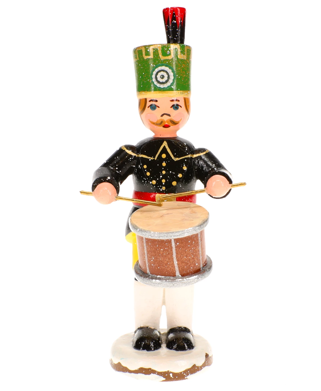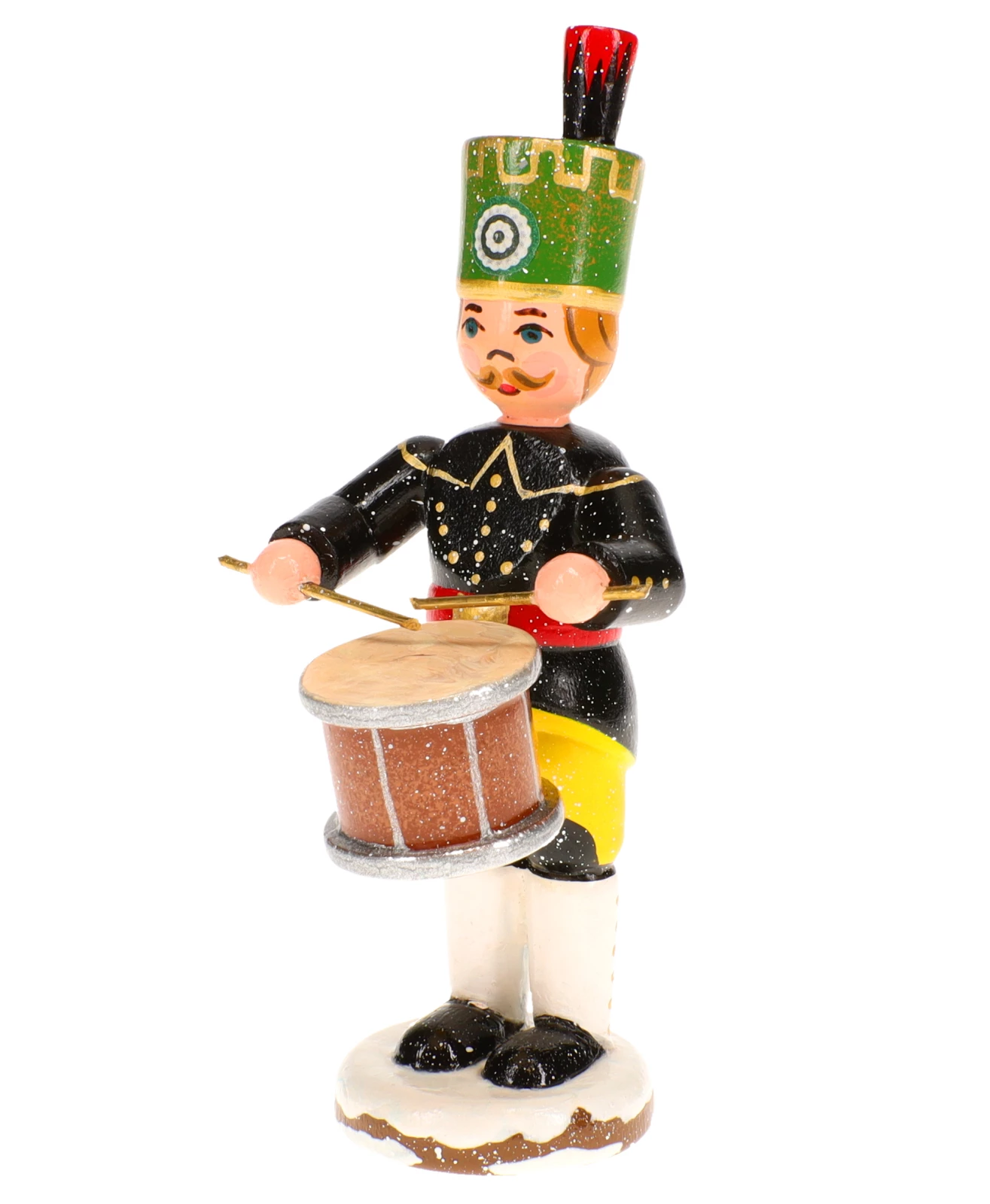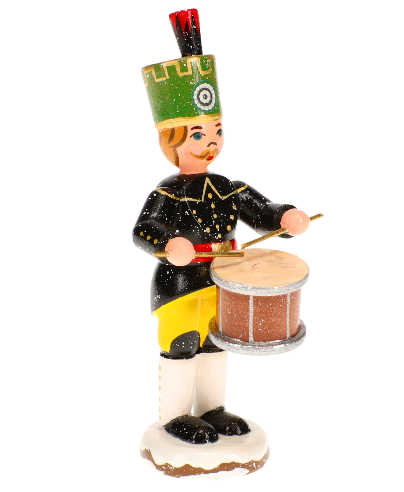 Der Hubrig Winterkinder – Bergmann mit Trommel bringt Rhythmus und Bewegung in die winterliche Welt der Hubrig Volkskunst. Auf einer schneebedeckten Bodenplatte steht der Bergmann aufrecht und kraftvoll, als würde er gerade den Takt für einen festlichen Umzug anstimmen. Feine Schneesprenkel auf Sockel und Kleidung verbinden die Figur harmonisch mit der winterlichen Szene.