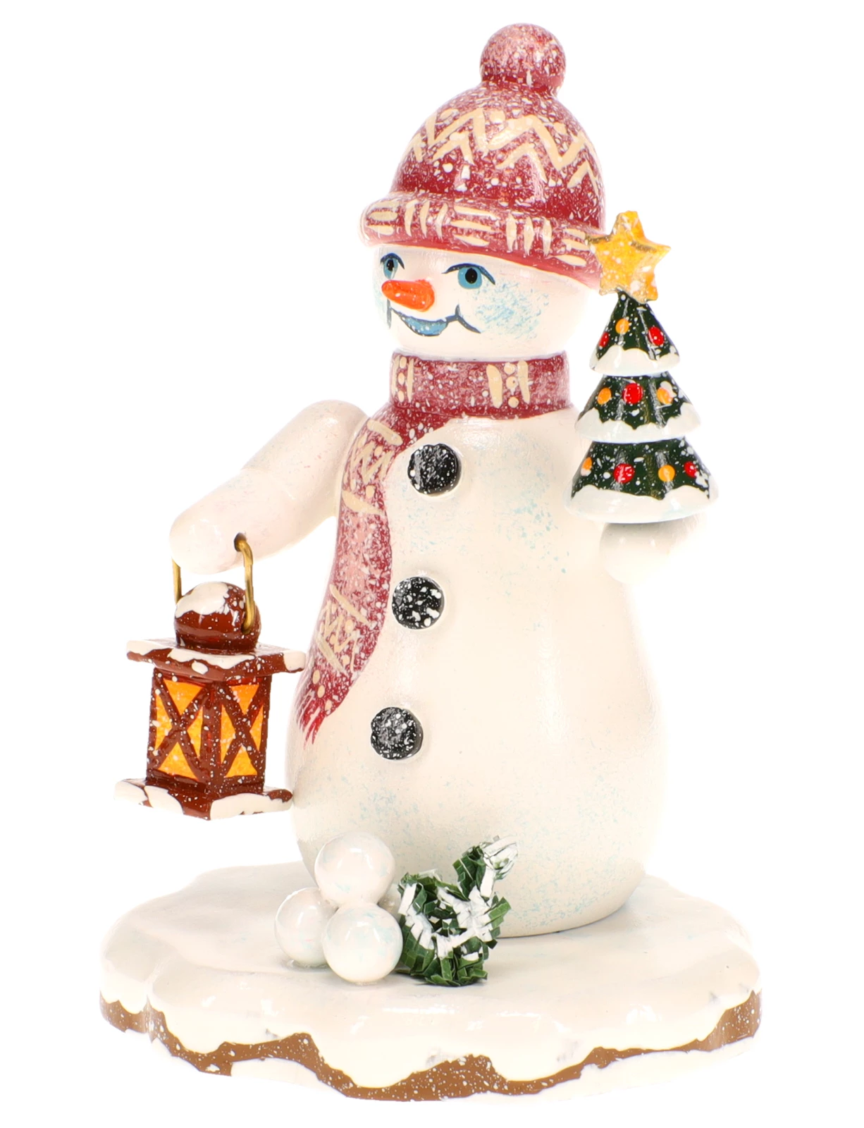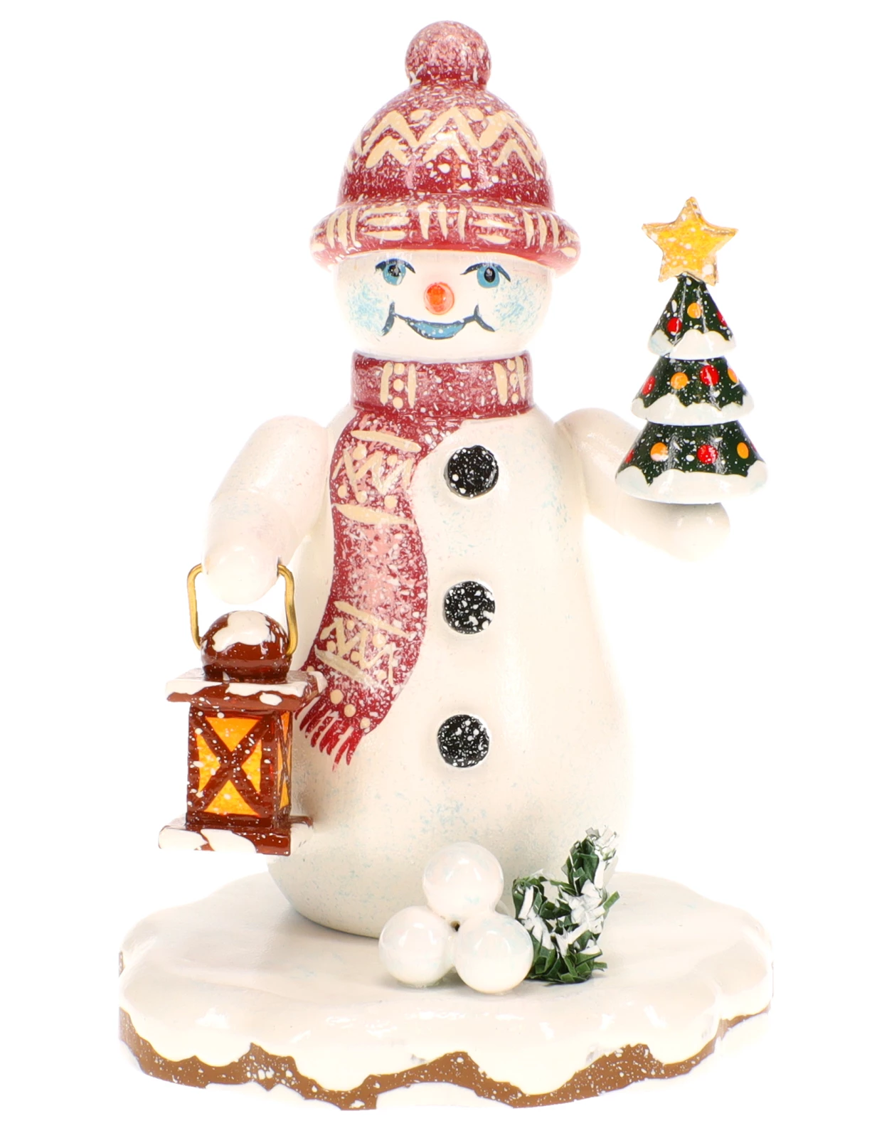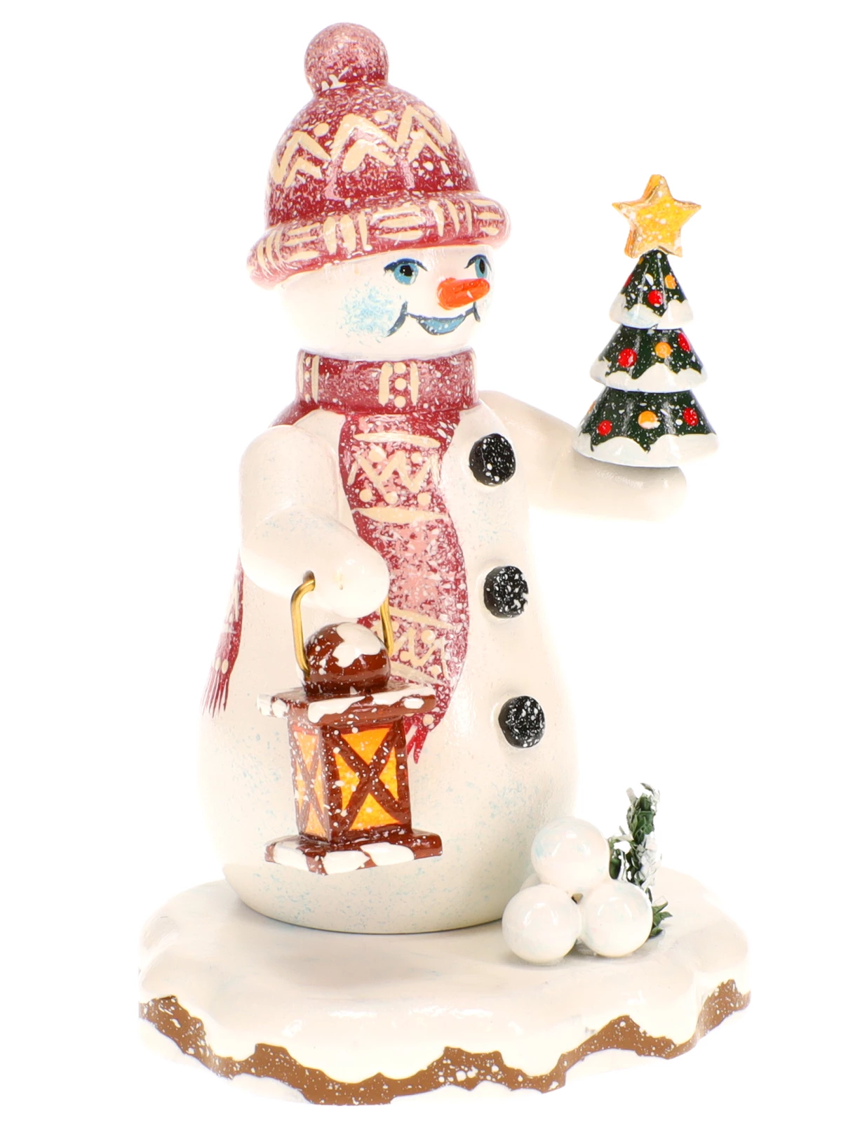 In seiner linken Hand hält der Schneemann eine braune Laterne mit goldfarbenem Bügel. Die gelblich-transparenten Einsätze lassen das Tannenlicht wie sanft leuchtend erscheinen, als würde es den Weg durch den Schnee erhellen. In der rechten Hand trägt er einen kleinen Tannenbaum, grün bemalt, mit bunten Kugeln geschmückt und an den Zweigspitzen weiß abgesetzt. Ein goldfarbener Stern krönt das Bäumchen und setzt einen feinen Akzent.